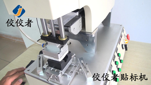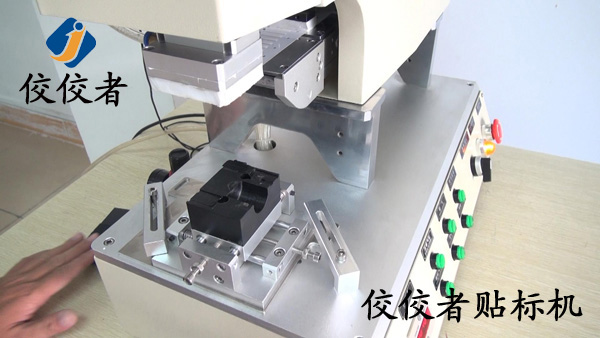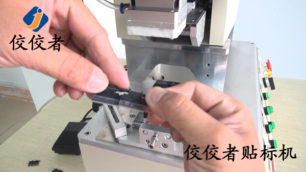 這臺高精度半自動平面貼標(biāo)機(jī)是上海的一個客戶為小黑片定制的平面貼標(biāo)機(jī),貼標(biāo)的時候把產(chǎn)品放到上圖的黑色小方塊上面的小槽中,機(jī)器上面部分便向下運(yùn)動為小黑片貼標(biāo),如下圖: