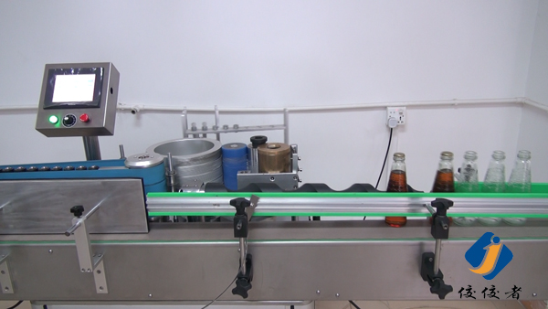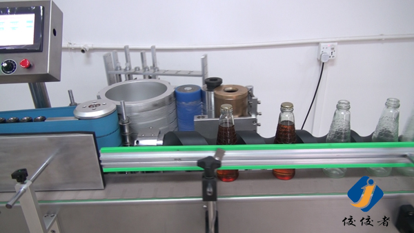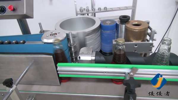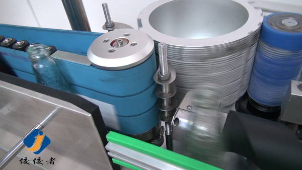看到上圖中玻璃瓶子后面有一條螺旋狀黑色柱體了嗎?那個圓柱體就把瓶子們的間距調節(jié)得與出標頻率吻合,瓶子們被一個個送到下圖這個傳送帶上進行貼標,傳送帶會準確地把已經糊好漿糊的標簽給貼上瓶子,如下圖: