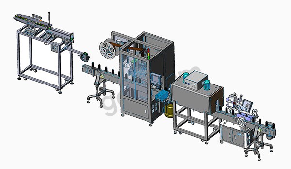 人工檢測放料→自動套標→自動貼標→自動抱瓶提升→自動分道→自動進入裝箱機